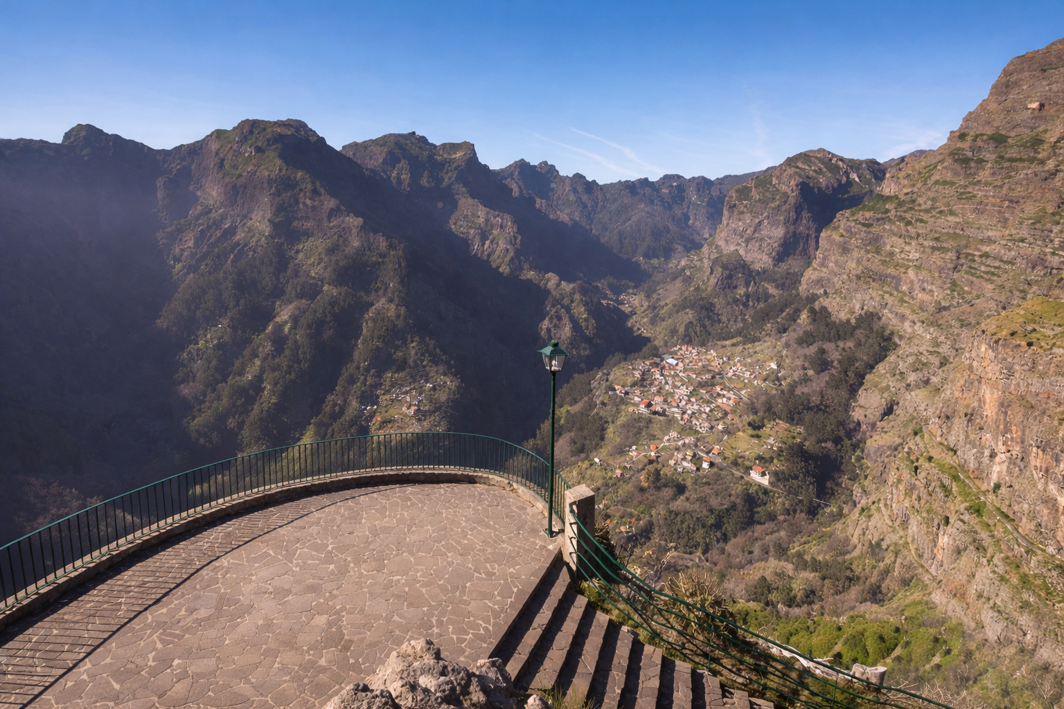 Eira do Serrado is situated at around 1,095 metres above sea level, in the central mountain range of Madeira. The viewpoint is easily accessible by road from Funchal, making it one of the most popular high-altitude viewpoints on the island. From the platform, visitors can admire the amphitheatre-like valley where Curral das Freiras lies, completely surrounded by towering peaks.